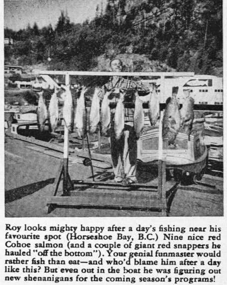 If there was one hobby Roy could have chosen as an alternate career, perhaps he would have run a fishing charter company. He was especially fond of sports fishing and salmon fishing. He was never happier than when — fishing rod in hand — he was fighting a sockeye salmon, chinook, or better yet a 46-pound tyee (which was his record catch). He was an avid angler who also loved going after deep-water lake trout up at Lake Temagami, Ontario. Before moving to Victoria, British Columbia, Roy fished for pickerel in Bobcaygeon, Ontario and took many a trip to a variety of fishing resorts with his old studio buddies.